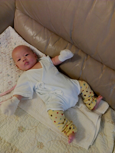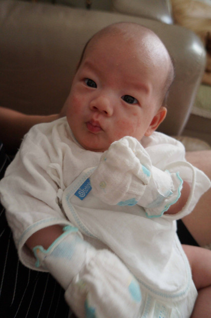 害得我只好又給他穿回短袖的紗布衣+肚兜